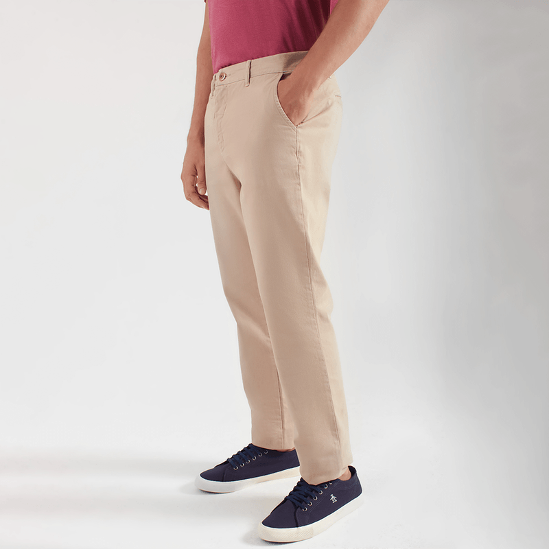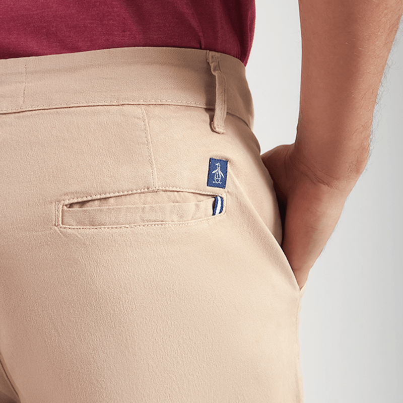 Eleve seu estilo com a calça chino original Penguin areia. Caimento slim perfeito para um look masculino sofisticado e moderno. Confira!