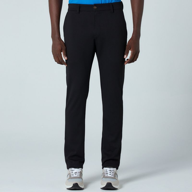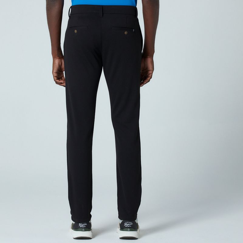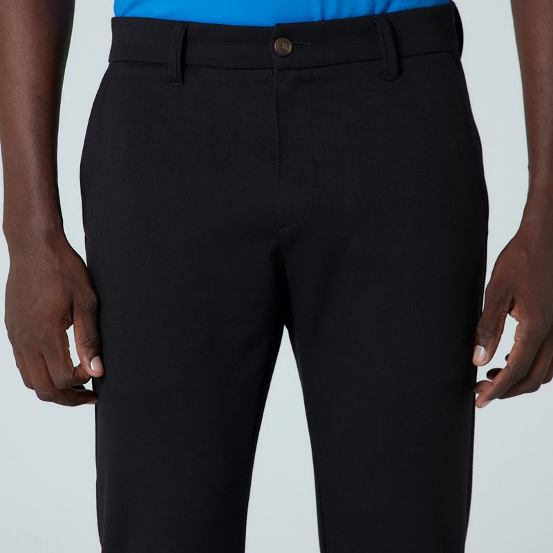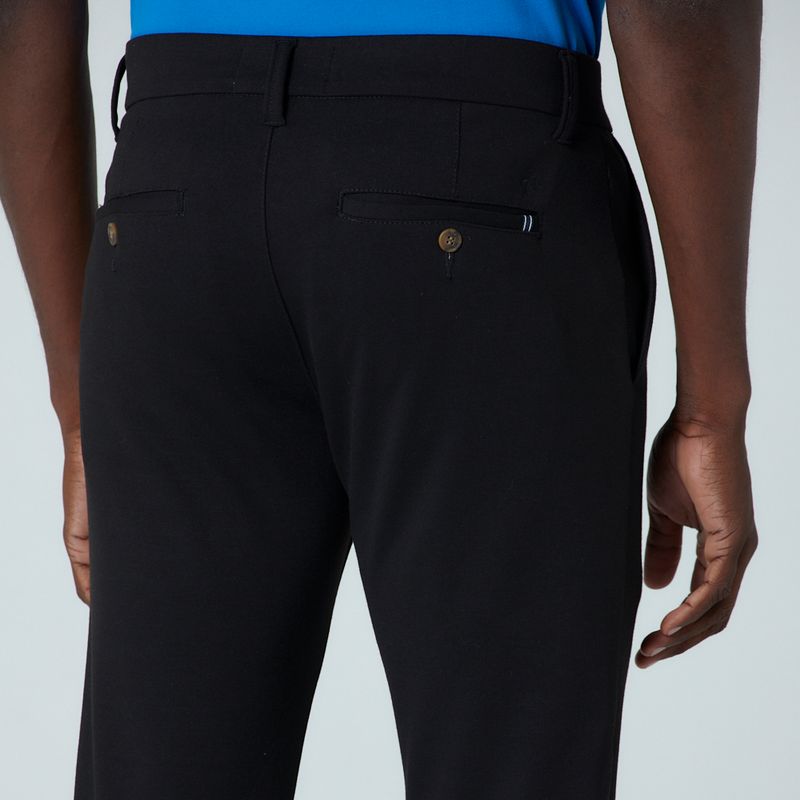 Calça com modelagem chino slim, sendo mais confortável na cintura e ajustada na barra, bolsos frontais em desenho "faca", bolsos traseiros embutidos. Cós confortável e com botão mesclado. Parte de tras com etiqueta personalizada com o logo da marca. Composição 73% Poliéster, 24% Viscose e 3% Elastano.