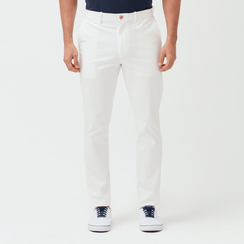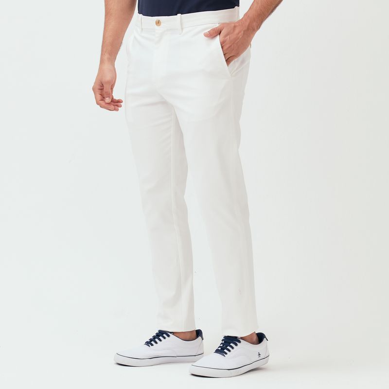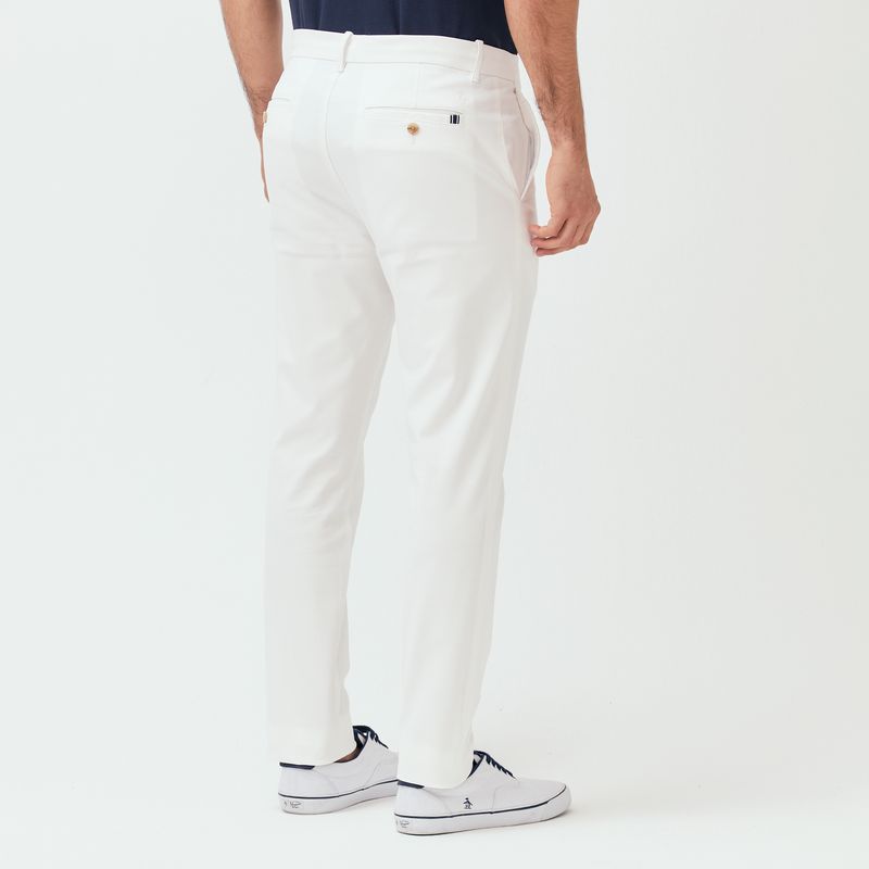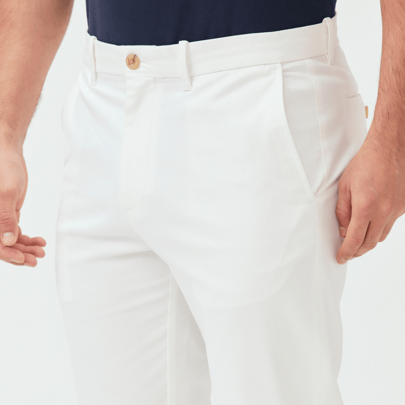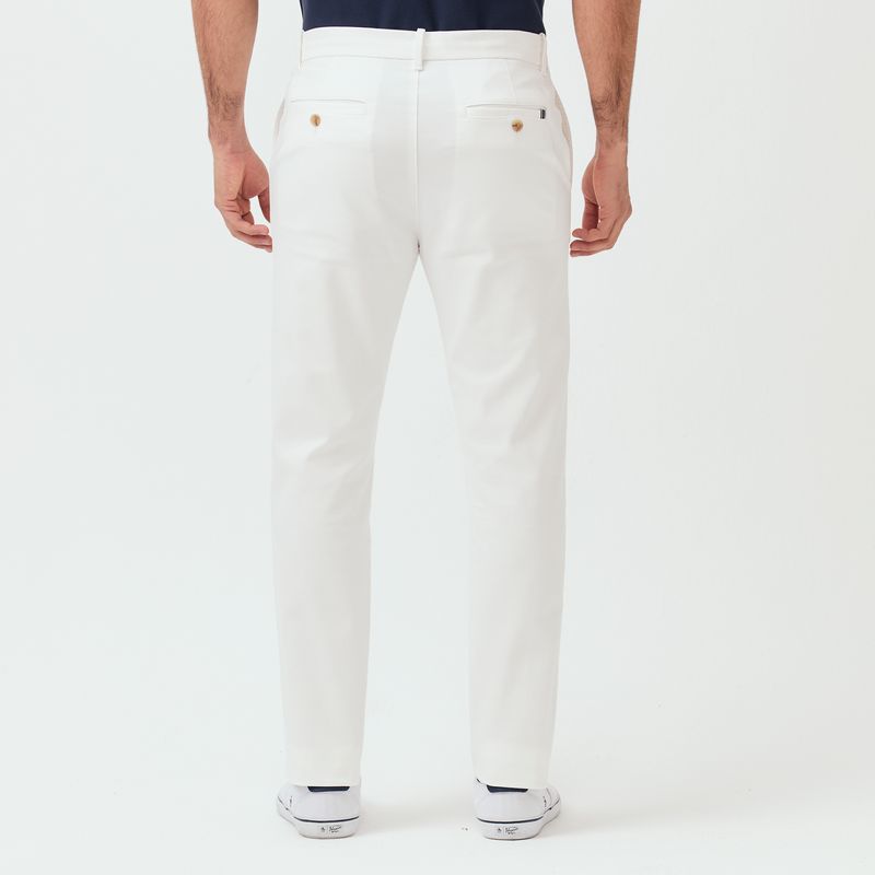 Calça chino “slim” em tecido sarja de algodão com elastano, bolsos em faca, detalhe de cadarço listrado no bolso traseiro, botões personalizados e assinatura logo “pete” em bordado no tom da peça. Composição: 96% algodão e 4% elastano.