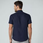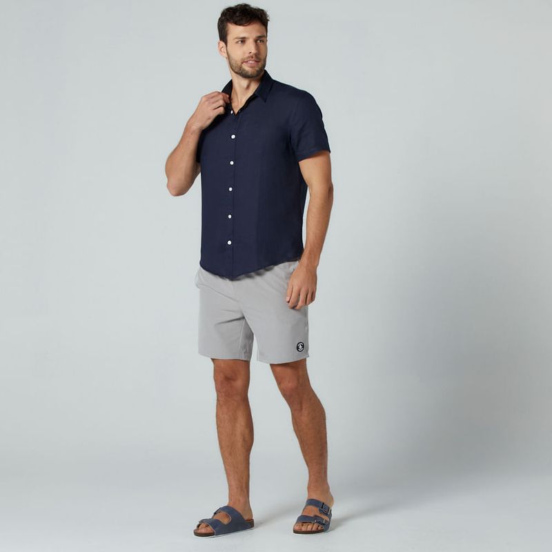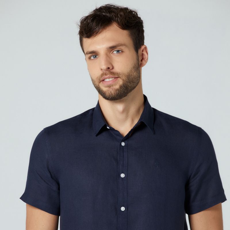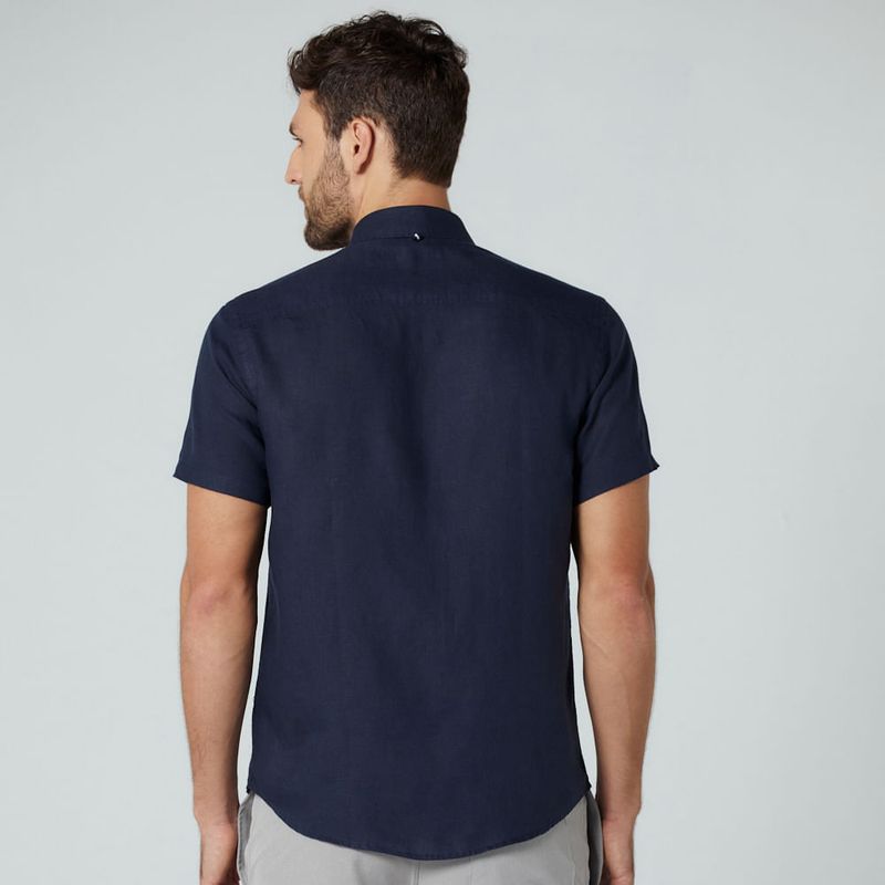 Camisa de linho confeccionada em tecido plano. A camisa masculina de manga curta tem caimento reto e um detalhe no peito em patch do Pete, mascote da marca.
