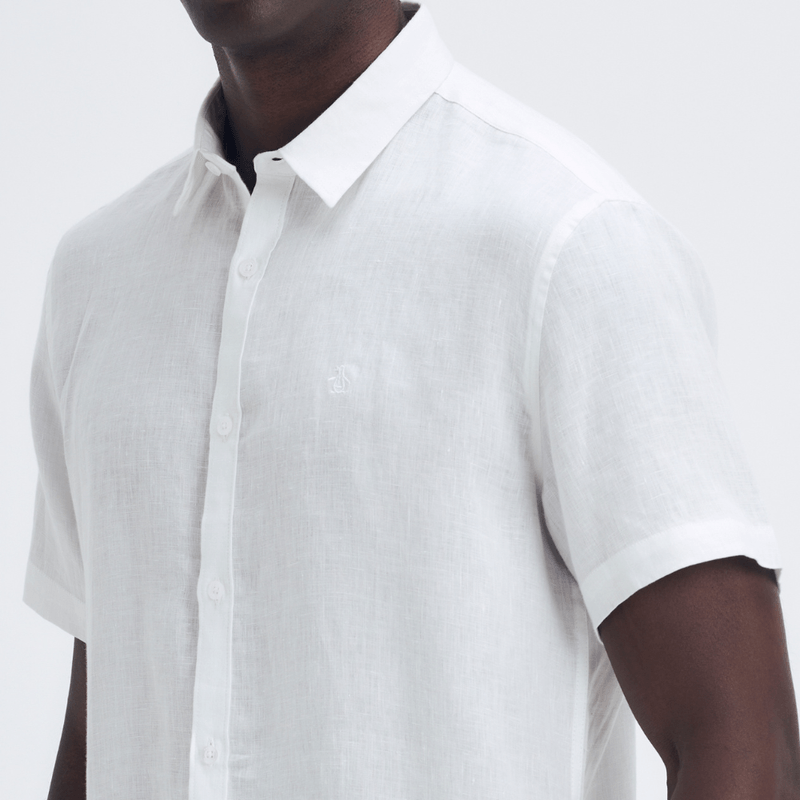 Camisa de linho confeccionada em tecido plano. A camisa masculina de manga curta tem caimento reto e um detalhe no peito em patch do Pete, mascote da marca.