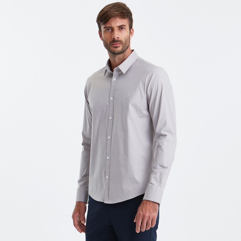 Camisa desenvolvida em base de modelagem regular, mais confortável ao corpo, manga longa, feita em tecido Oxford Stretch de algodão e alastano. Uma peça de vestuário bastante versátil, onde a combinação das fibradas usadas na costrução do tecido proporciona uma maior elasticidade, permitindo liberdade de movimento. A assinatura Original Penguin fica por conta dos botões personalizados e bordado na cor da peça. Nosso modelo tem 1,89m de altura e usa camisa tamanho M.