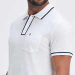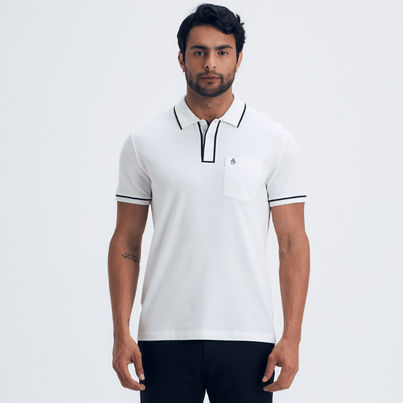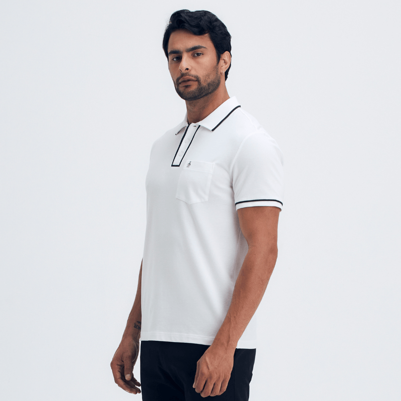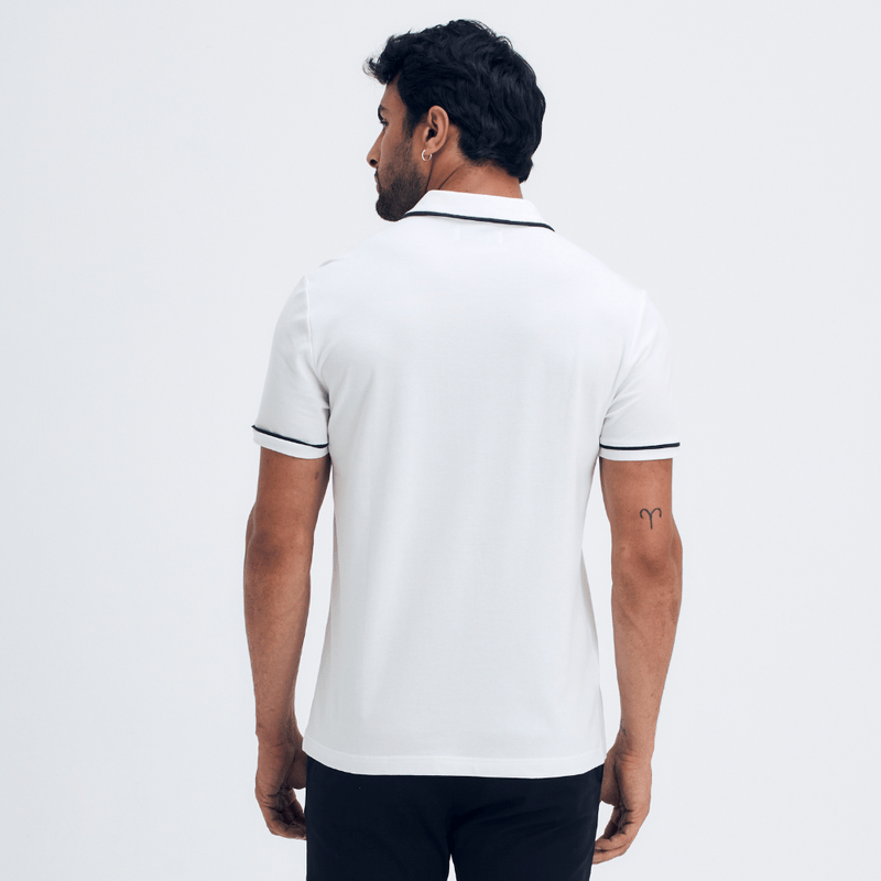 Polo modelagem "regular" em malha leve piquet de algodão, tencel tm lyocell e elastano, com frisos em cor contrastantes na gola e nas mangas, bolso frontal e assinatura logo em "pete" em pacth termocolante.
