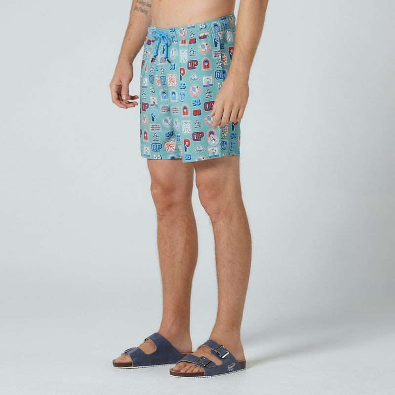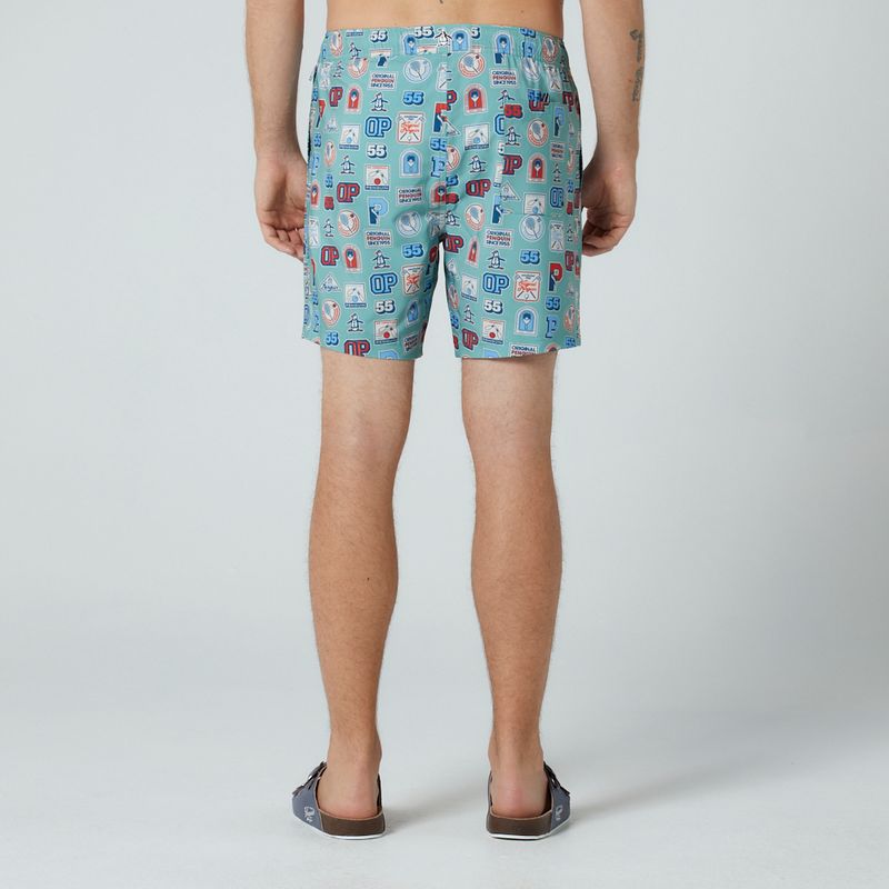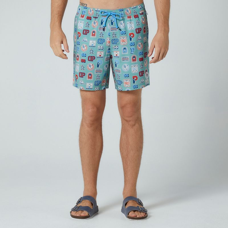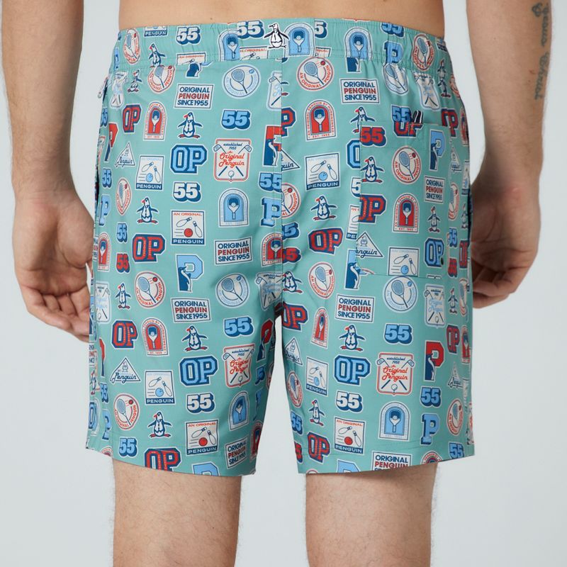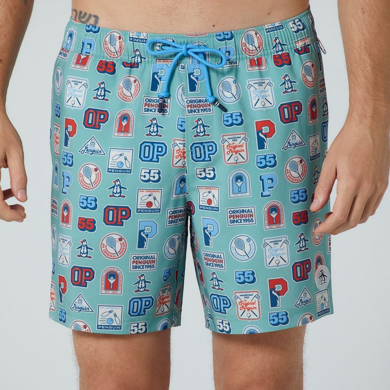 Shorts em tecido de poliéster e elastano, com sunga interna em malha, cós em elástico, cadarço para ajuste na cintura, bolso traseiro com fechamento em velcro, estampa college e assinatura patch emborrachado Original Penguin. Composição: 55% Poliéster reciclado e 45% Poliéster. Forro: 50% Poliéster reciclado, 50% Poliéster.